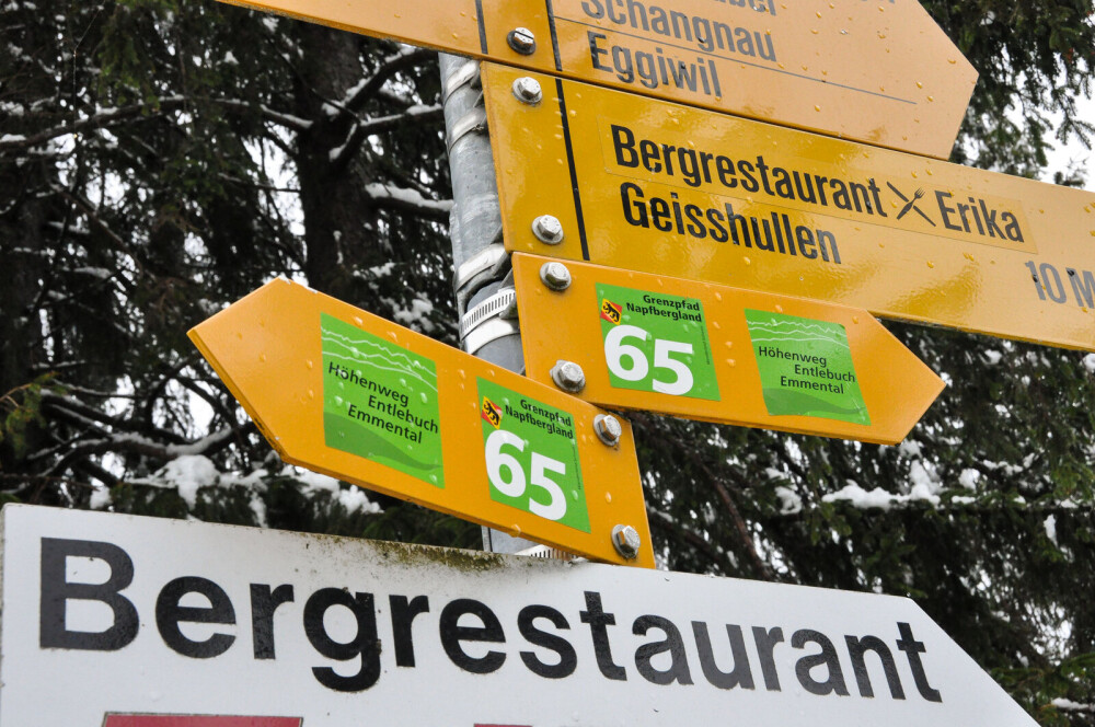 Der Wanderweg führt ganz oben dem Grat entlang. Der linke Fuss steht im Kanton Luzern, der rechte im Kanton Bern. Und weil heute Fronleichnam ist, hat der linke Fuss Feiertag, der rechte Donnerstag. Im Moment ist das den beiden allerdings egal. Sie stehen im Schneematsch und frieren. Es hat nochmals geschneit, man hört die Kühe der nahegelegenen Alp Rämisgumme wütend muhen in ihrem Stall, weil sie doch viel lieber draussen auf den Weiden wären. Werner Stirnimann und Ruedi Wyss von der IG Grenzpfad Napfbergland lassen sich von den paar Flocken nicht abschrecken. Sie schauen vor Ort, wie man die Alp Rämisgumme mit ihrem Hoflädeli besser an den Grenzpfad anbinden könnte.